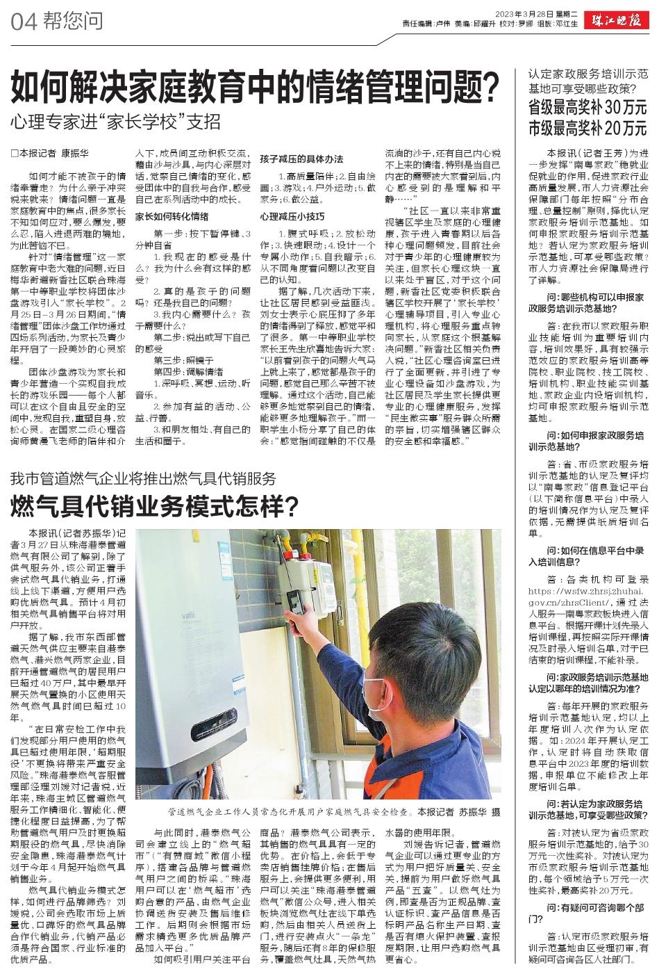 本報訊(記者蘇振華)記者3月27日從珠海港泰管道燃?xì)庥邢薰玖私獾,除了供氣服?wù)外,該公司正著手嘗試燃?xì)饩叽N業(yè)務(wù),打通線上線下渠道,方便用戶選購優(yōu)質(zhì)燃?xì)饩摺nA(yù)計4月初相關(guān)燃?xì)饩咪N售平臺將對用戶開放。據(jù)了解,我市東西部管道天然氣供應(yīng)主要來自港泰燃?xì)、港興燃?xì)鈨杉移髽I(yè),目前開通管道燃?xì)獾木用裼脩粢殉^40萬戶,其中最早開展天然氣置換的小區(qū)使用天然氣燃?xì)饩邥r間已超過10年。